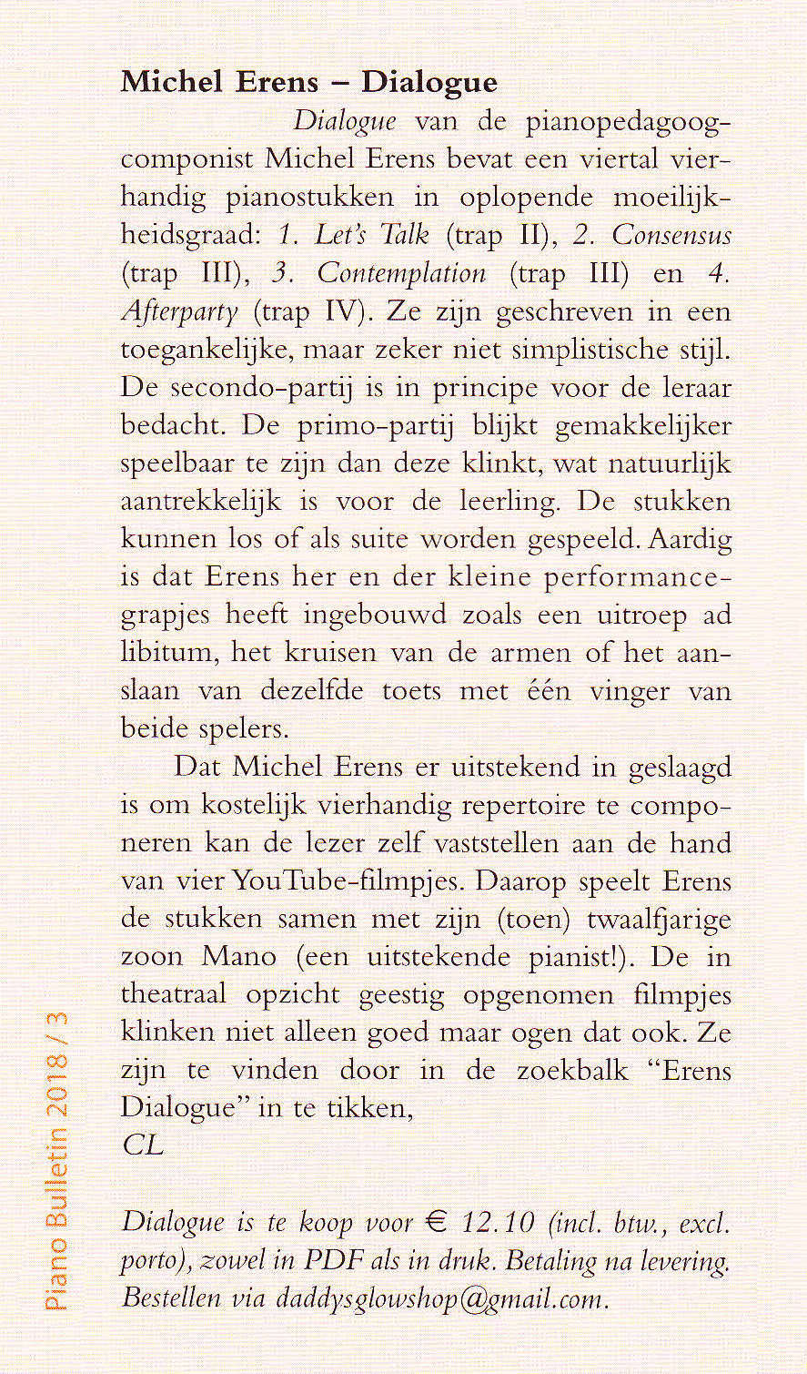 Vierhandige pianowerken zijn altijd gewild in de lespraktijk en dus besloot ik er een aantal zelf te schrijven. In 2018 gaf ik ze samen uit in een bundel onder de naam Dialogue. Er kwamen veel goede reakties  op en aansluitend gaf ik er een aantal voordrachten over. Er verscheen ook een recensie in ‘Piano Bulletin’ het blad van de EPTA (European Piano Teachers Association).